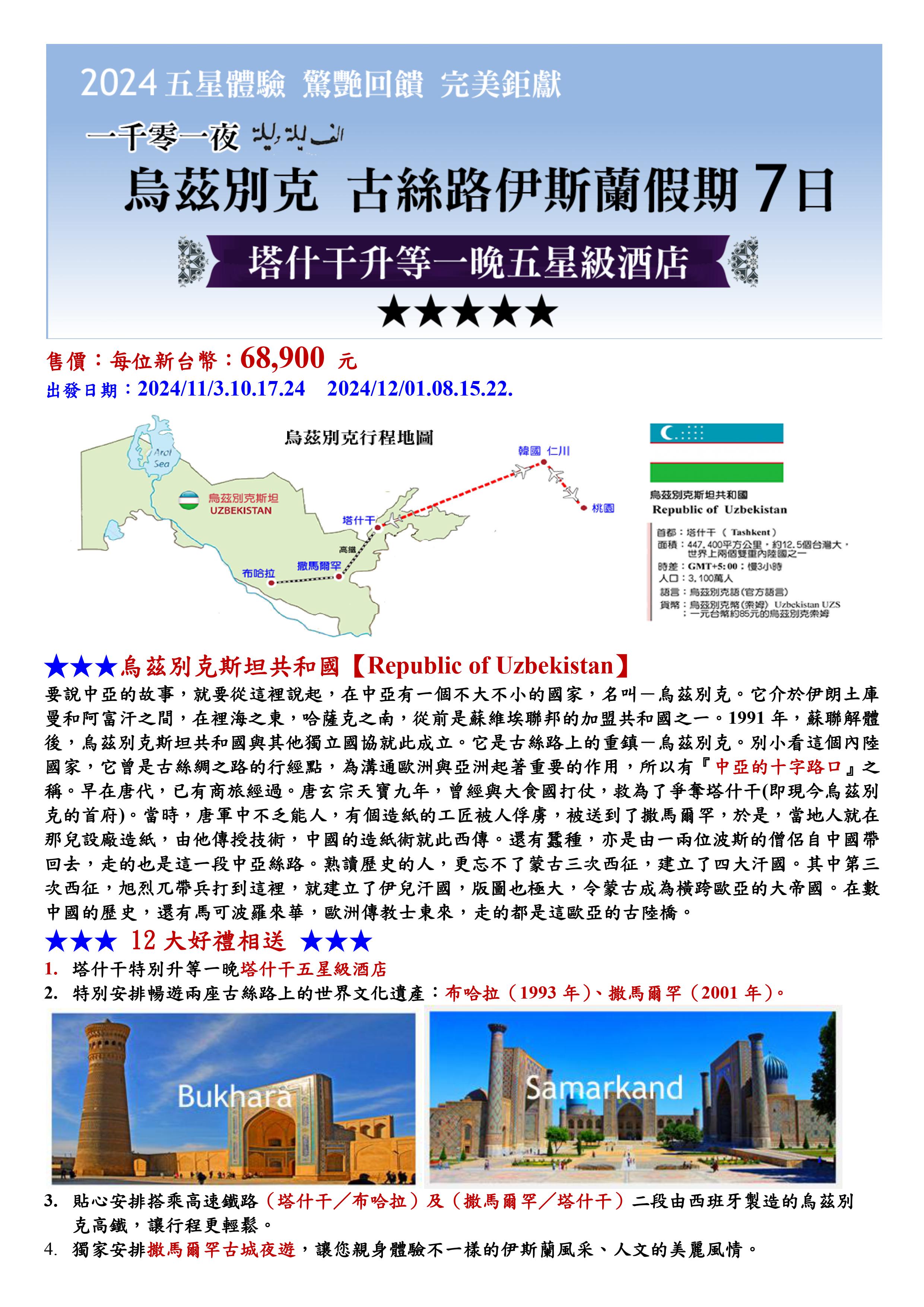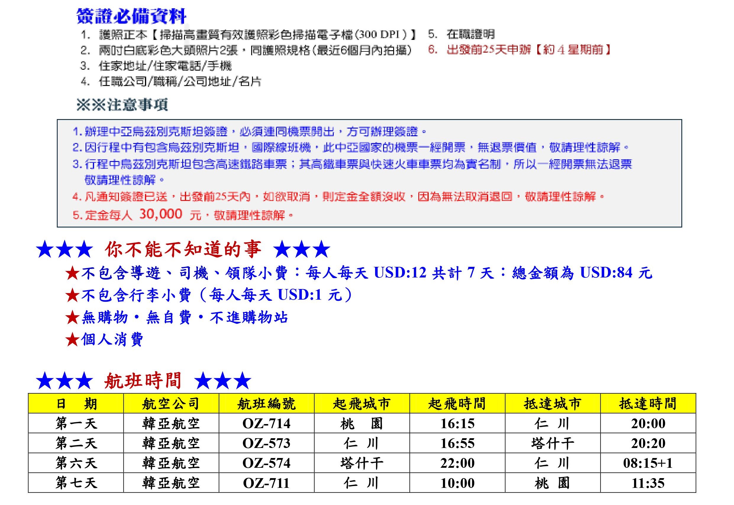 2.韓國‧仁川搭機飛往中亞烏茲別克斯坦‧塔什干飛行時間較長約為6小時左右,敬請妥善休息。