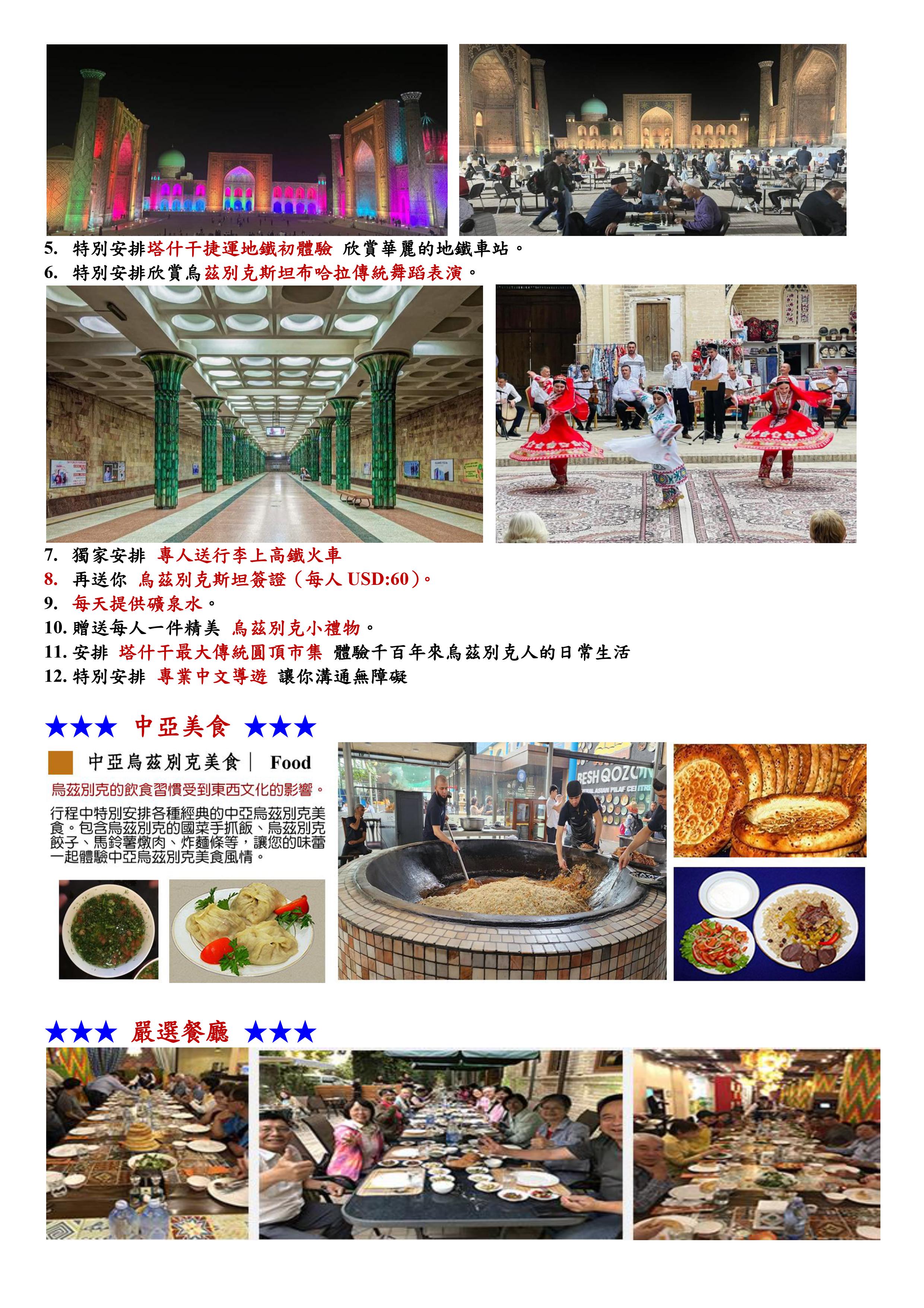 景點:塔什干市區觀光:聖伊瑪目建築群、獨立廣場、帖木兒廣場、塔什干地鐵、塔什干城市購物中心