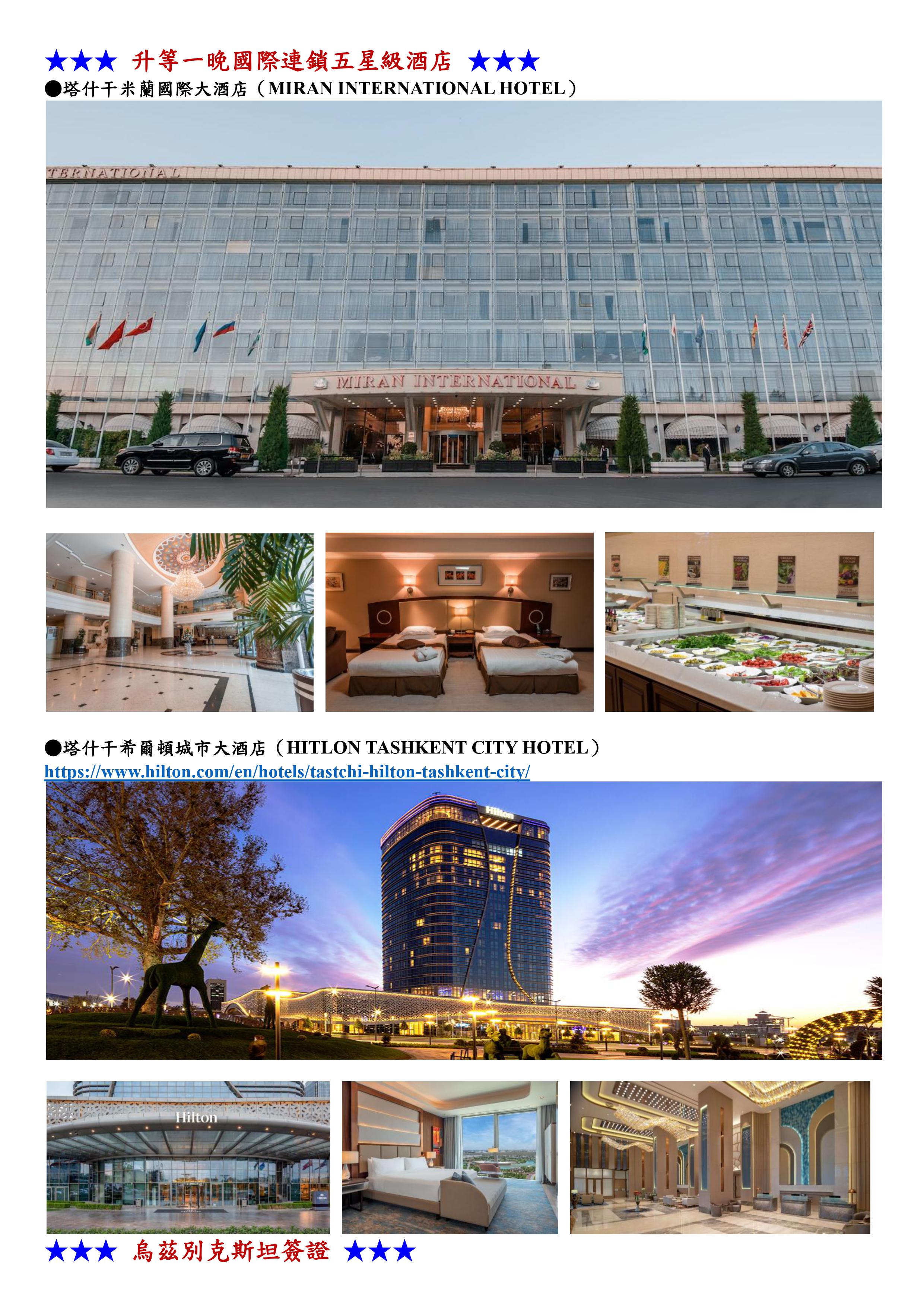 MIRAN INTERNATIONAL HOTEL 或 TASHKENT INTERNATIONAL HOTEL 或 HILTON TASHKENT CITY HOTEL | |