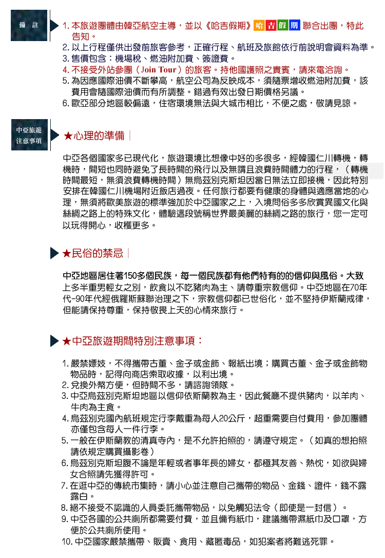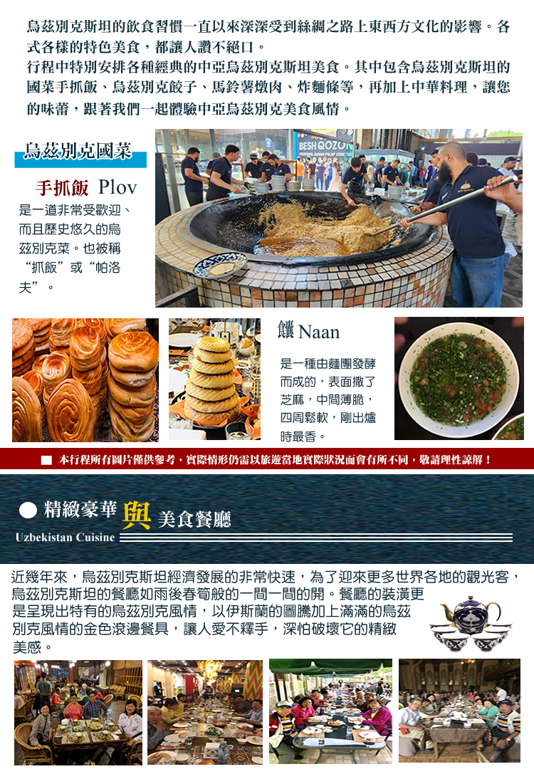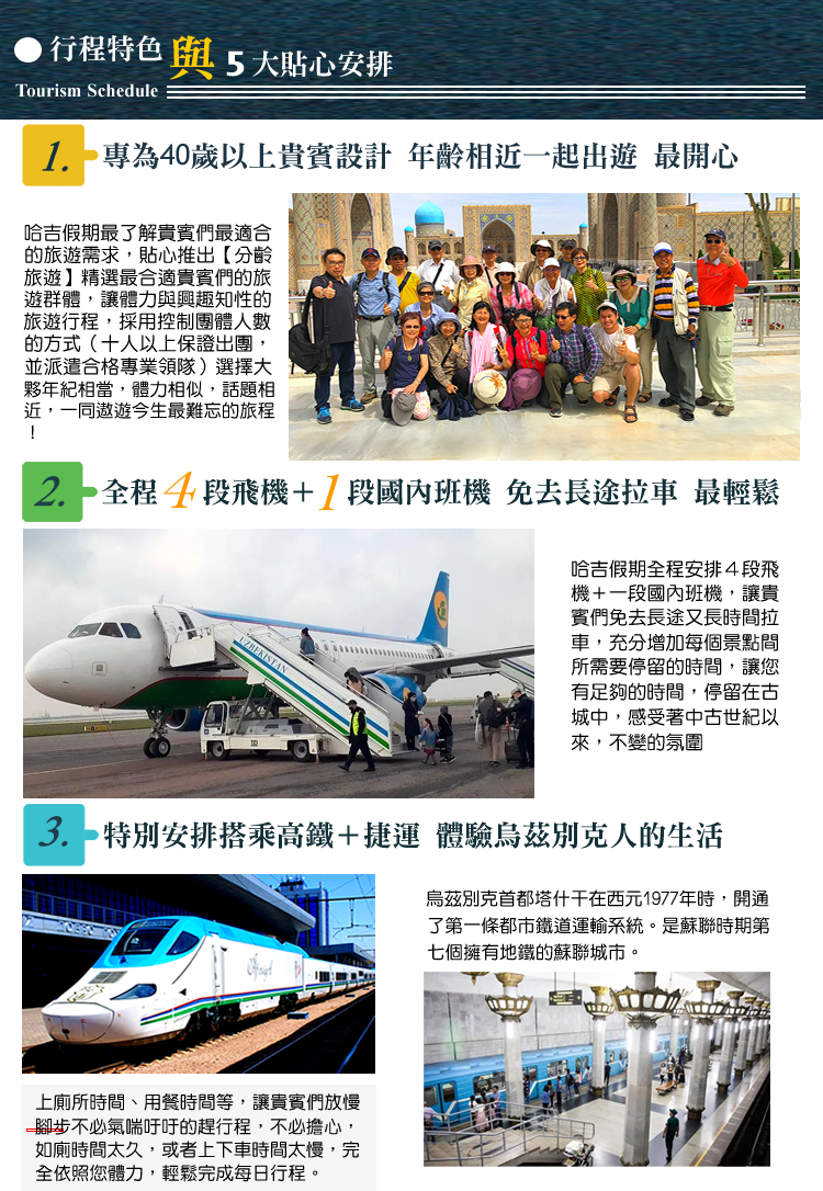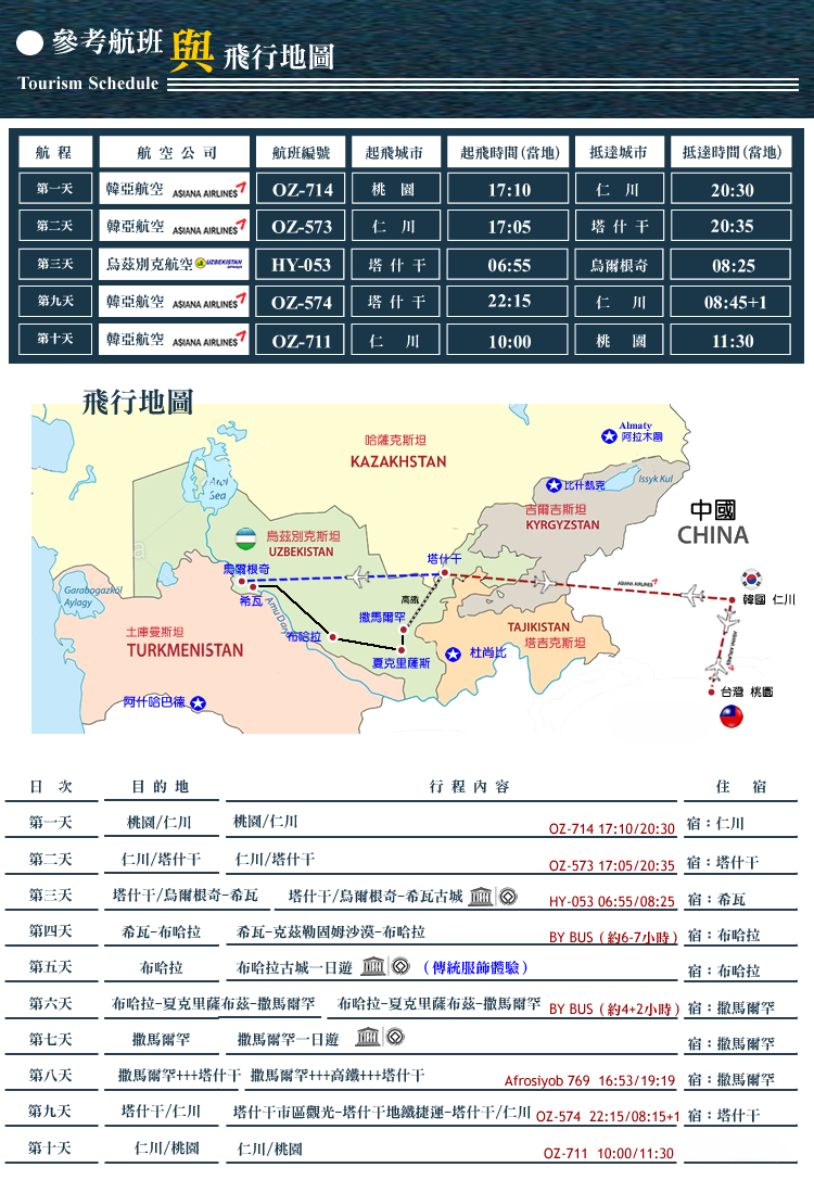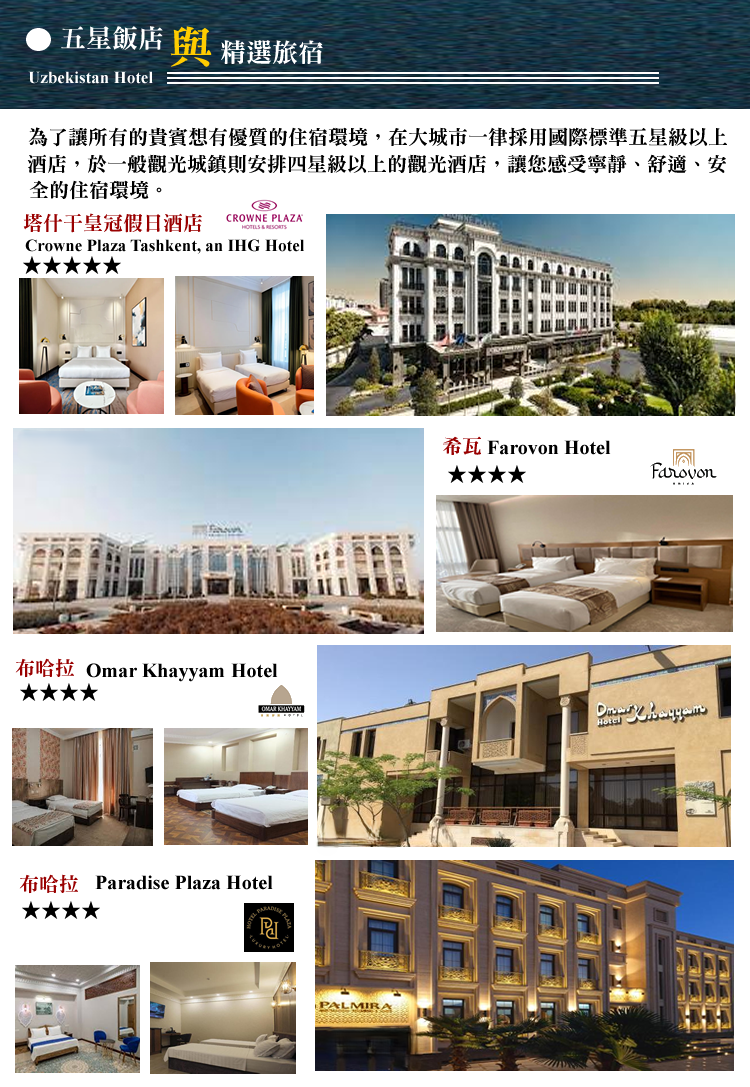 隨後安排前往參觀塔什干地鐵【Tashkent metro】、傳統市集【Bazaar】晚餐後前往機場搭機返回韓國仁川機場,準備搭機返回到台灣溫暖的家。揮揮衣袖,告別這個由陌生變熟悉的國度,收拾起美麗的回憶,又為人生相簿多添色彩。