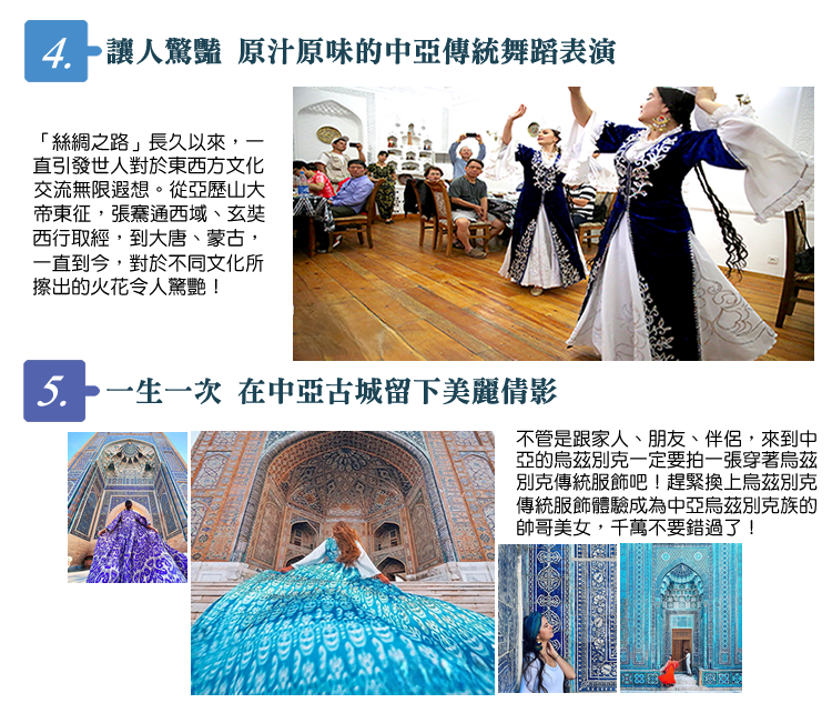 【烏茲別克傳統服飾體驗(含拍照)】全國獨家安排穿著雌茲別克傳統服飾拍照。不管是跟家人、朋友、伴侶,來到中亞的烏茲別克一定要拍一張穿著烏茲別克傳統服飾吧!今天就要幫大家安排不管是在雷吉斯坦廣場、比比哈姆清真寺還是傳統市集周邊通通有!趕緊換上烏茲別克傳統服飾體驗成為中亞烏茲別克族的帥哥美女,千萬不要錯過了!