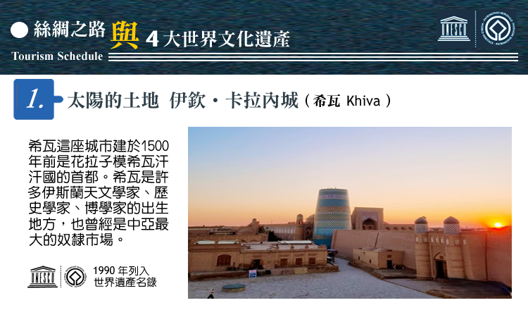 【希瓦】歐亞大絲路的中心,希瓦最早是因為絲路的途中有一口甘泉井而慢慢建立的城市,而後又有不少的汗國佔領過此地,包括花元朝時的花剌子磨、察哈台汗國等。在中亞流傳著一句古諺:「我願以兩袋黃金的代價,但求看一眼希瓦。」曾為花剌子模地區的希瓦,因為絲路貿易與奴隸市場帶來豐碩的稅收。希瓦城猶如童話般的中亞古城,保存著奇妙的古跡,宛如一座露天博物館,教人嘆為觀止!傳說中希瓦是諾亞的兒子,閃,在此地發現一座井而命名的。這裡曾是絲路支線前往裏海及伏爾加河流域的貿易站,此地在帖木兒十四世紀末的大毀滅後益形重要,並成為中亞三大汗國之一。希瓦最重要的觀光景點是伊羌卡拉-內城,全部在1970-80年代整建完畢,並於【UNESCO, 1999】成為聯合國教科文組織指定保護的人類文明遺產。