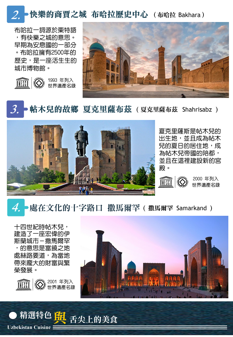 【撒馬爾罕】是烏茲別克的第二大城,也是中亞最古老的城市,Samarkand突厥語為富庶之地,坐落在海拔710公尺的澤拉夫尚河谷地,此為絲路西段(北路)必經之地,為印度、波斯、突厥、中國等商賈交流買賣重鎮,漢代曾稱此地為「康居」,故融合了印度、伊朗、蒙古、中國及歐洲文化。西元329年被亞歷山大帝攻佔,當亞歷山大進入撒馬爾罕時,忍不住的稱「除了比我的想像來的更美麗外,其餘我所聽到有關撒馬爾罕的傳說都是真的」。