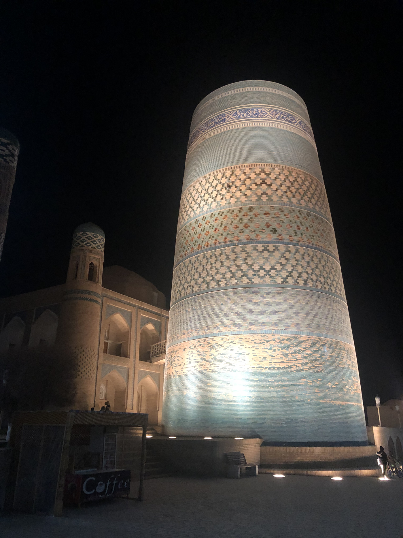 【伊斯蘭卡加神學院與宣禮塔】建於20世紀初,是希瓦最新的伊斯蘭紀念碑。Islam Khoja是20世紀初希瓦重要的大臣和開明人士,他創見了一所歐式學校,引入長途電報,並修建了一座醫院。