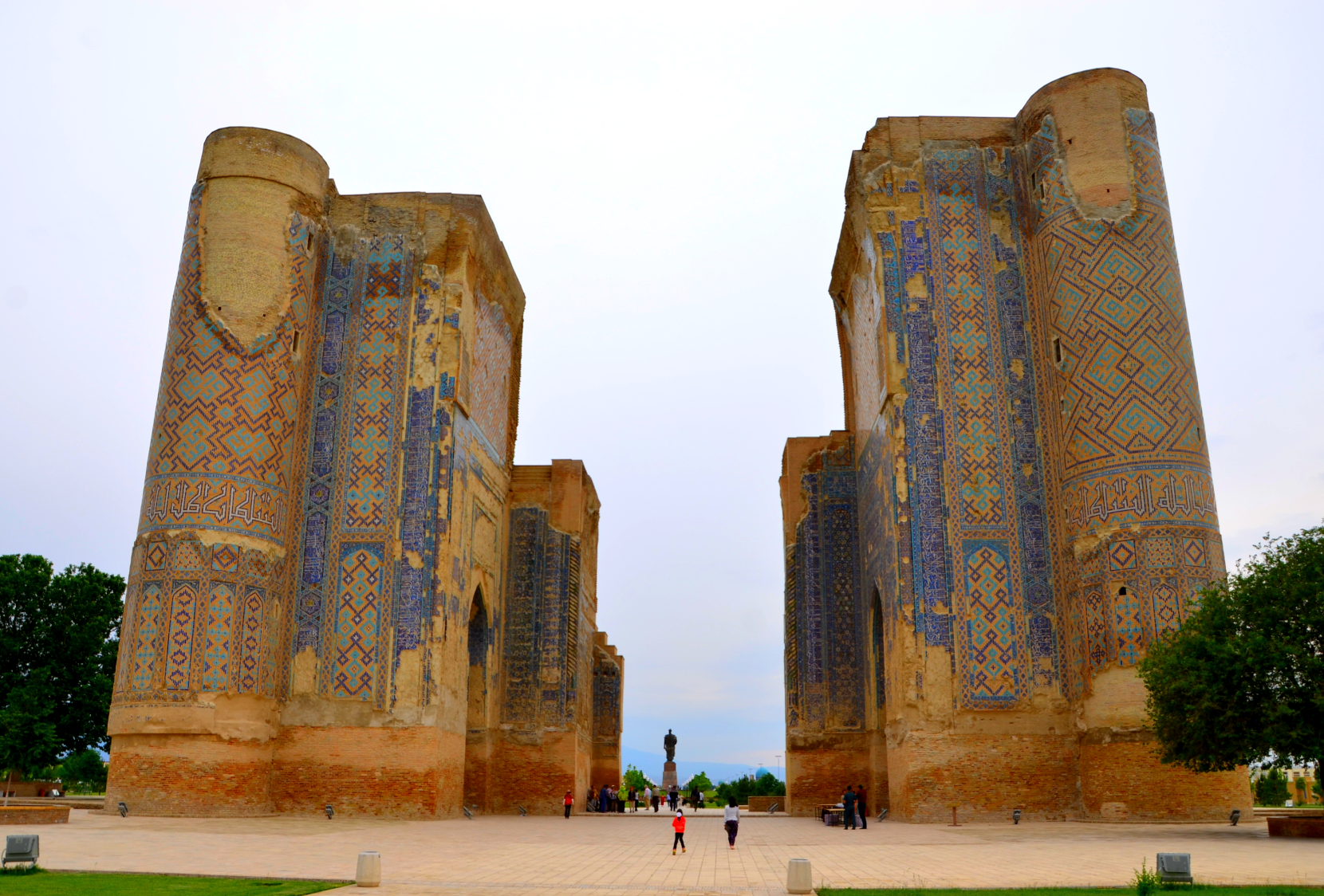 【亞克薩賴伊宮】帖木兒夏宮遺址;在擊敗花剌子模之後,帖木兒從那裏引進了許多優秀的工匠,共花費 24 年的時間建造這座夏宮,其壯觀的程度足以和薩瑪爾罕的任何建築媲美,但宮殿目前僅剩下一座高40 公尺的門廊。