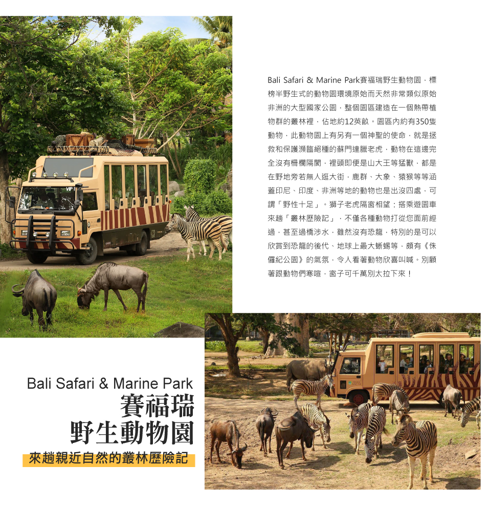 台北→(航程5小時)峇里島→前往賽福瑞野生動物園 /享受園內活動設施