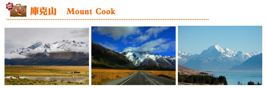 紐西蘭是健行者的天堂,擁有許多百萬級景觀的步道,庫克山Mount Cook是紐西蘭最高峰,海拔3724公尺。庫克山是紀念最早發現紐西蘭的庫克船長,毛利語為奧拉基Aoraki,意思為穿透雲層的山脈。庫克山是來紐西蘭不可以錯過的景點,有許多壯闊美景的健行步道而聞名,推薦Kea Point Track 啄羊鸚鵡步道是個老少咸宜的簡易步道,步道終點的KeaPoint能同時欣賞冰河堰塞湖Muller Lake和紐西蘭最高峰庫克山,是壯觀且非常難得的景緻。